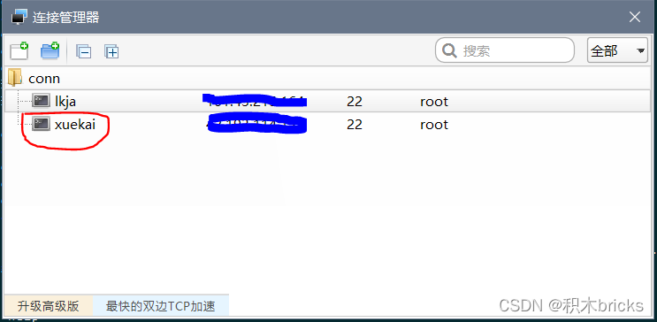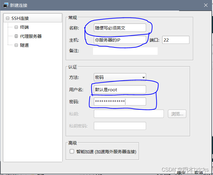 填写蓝色圈起来的四项。密码是服务器密码。点击确定。