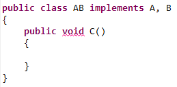 public class ClassD extends AbstractC { public void A2(){} // 我必须实现InterfaceA中未被实现的A2()方法 public void B1(){} // 我必须实现InterfaceB中未被实现的B1()方法 void C(){} // 我必须实现AbstractC中未被实现的C()方法 }