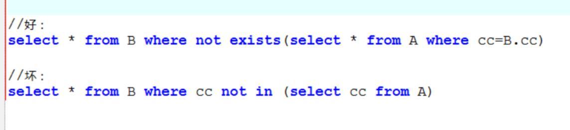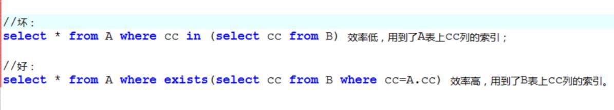 如果查询语句使用了not in 那么内外表都进行全表扫描,没有用到索引;而not exist 的子查询依然能用到表上的索引。所以无论哪个表大,用not exists都比not in要快!