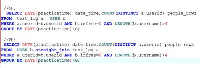 mysql hint: Mysql 优化器在处理多表的关联的时候,很有可能会选择错误的驱动表进行关联,导致了关联次数的增加,从而使得sql语句执行变得非常的缓慢。 这个时候需要有经验的DBA进行判断,选择正确的驱动表,这个时候 straightjoin 就起了作用了,下面我们来看一看使用straight_join进行优化的案例: 尝试采用user表做驱动表,使用straight_join强制连接顺序: