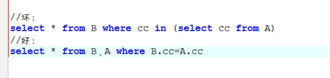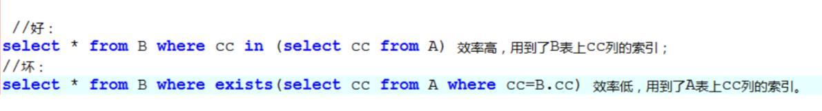 如果查询的两个表大小相当,那么用in和exists差别不大。 如果两个表中一个较小,一个是大表,则子查询表大的用exists,子查询表小的用in: 例如:表A(小表),表B(大表) 示例一: