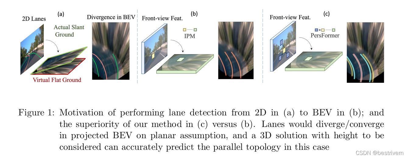 在前视图上做2D图像的分割技术很成熟,但是2D的图像空间不适用于复杂的工业级场景。为什么这么说呢,有两方面原因,一方面是下游的任务例如PNC更需要BEV视角的检测结果,有些方法将前视图上的车道线分割结果通过相机内外参变换到BEV空间,有些则更优雅的通过相机内外参将前视图的特征变换到BEV空间的特征,但这样的话BEV的特征强依赖于前视图的特征,会受到前视图中遮挡,scale变换的很大的影响。另一方面,我们应该要考虑车道线本身的height,这个height定义为车道线在BEV 3D空间中,在主车坐标系中相对于0点的z坐标。因为假如在上坡或者下坡过程中,如果不考虑路面高度的变化,那么车道线将会相交或者发散,这会影响pnc的决策。之前的方法都是认为在BEV空间中车道线都是位于平摊的路面上,即其高度为0。上图中的b就是说在一些复杂的场景中,简单的直接将feature做ipm变换到bev空间,效果并不是很好。