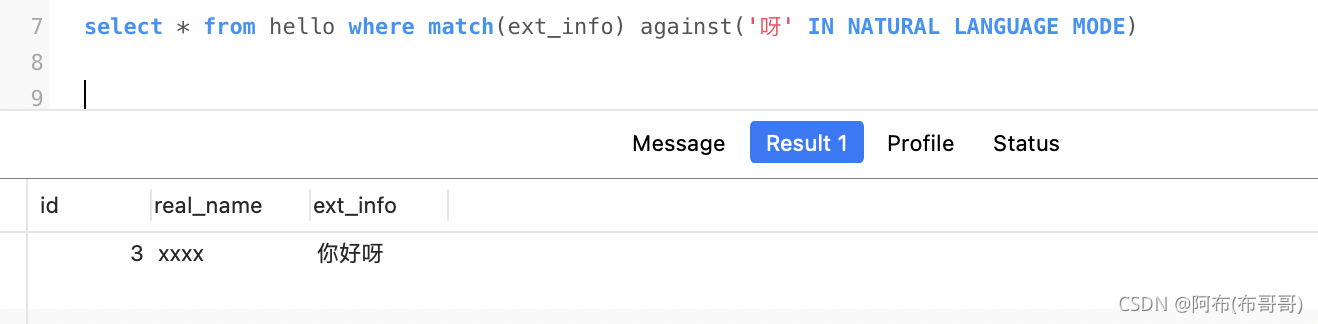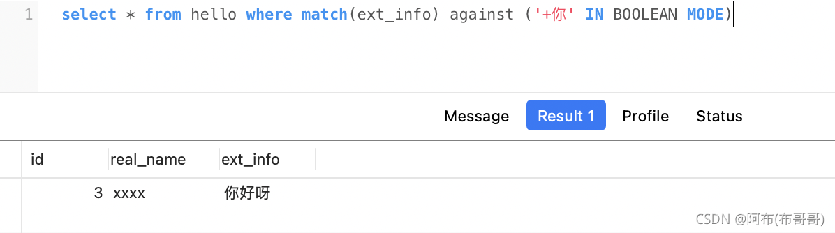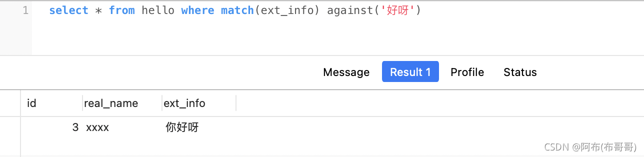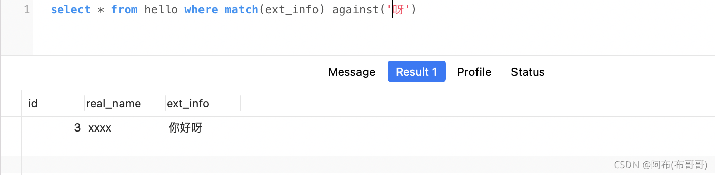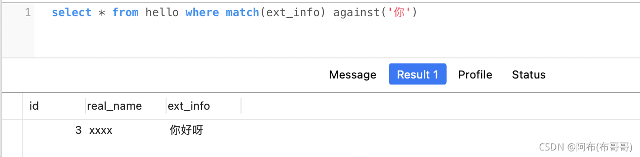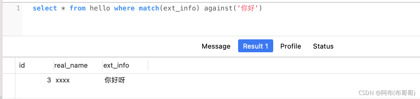 CREATE FULLTEXT INDEX ext_info ON hello (ext_info) WITH PARSER ngram;第三步,开始检索