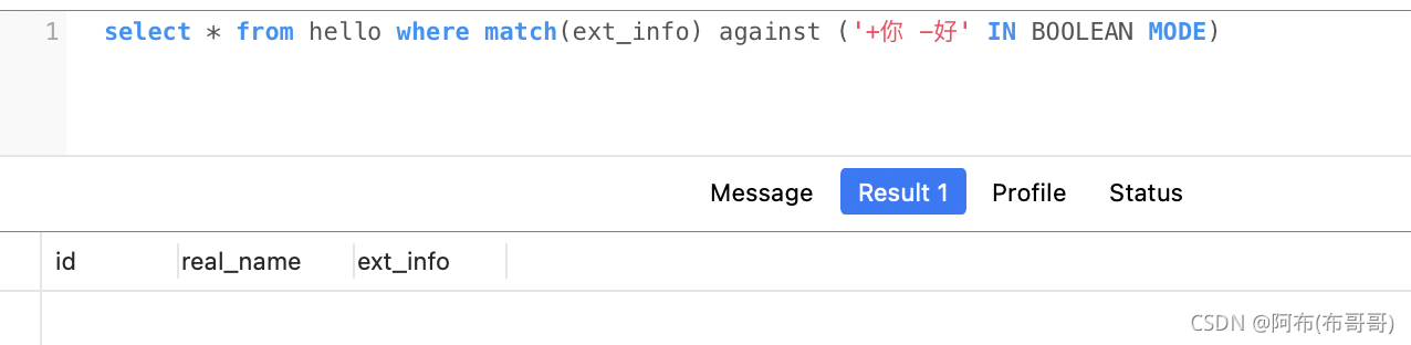 select * from hello where match(ext_info) against ('+你 -好' IN BOOLEAN MODE)
