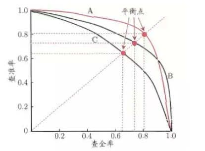 (2)若两个学习模型的P-R曲线互相交叉,则可通过“平衡点”(Break-Event Point,简称BEP)来评价模型的优劣,BEP是“查准率=查全率”的数值。由上图可知,模型A的平衡点大于模型B的平衡点,即模型A优于B。
