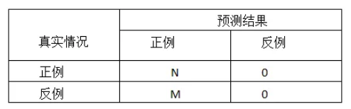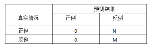 测试数据集包含N例正样本和M例负样本,若阈值设置的最大,则学习模型对所有测试样本都预测为负样本,混淆矩阵如下: