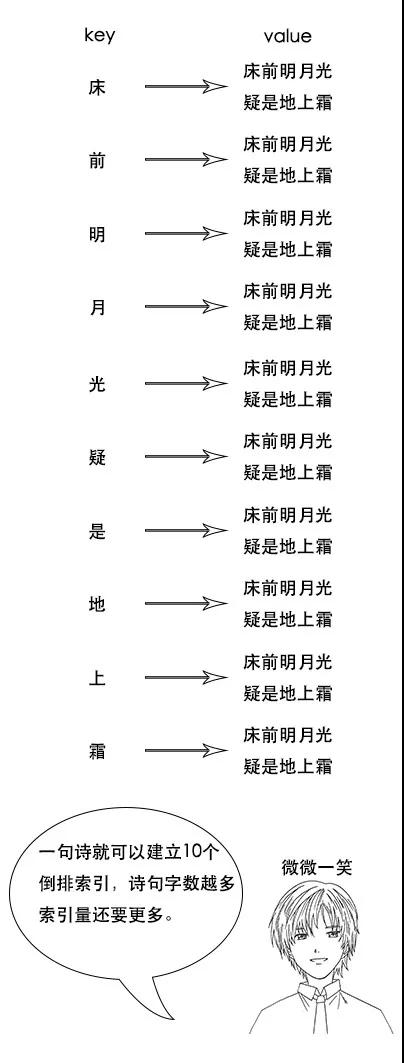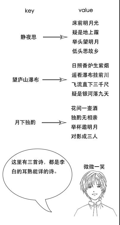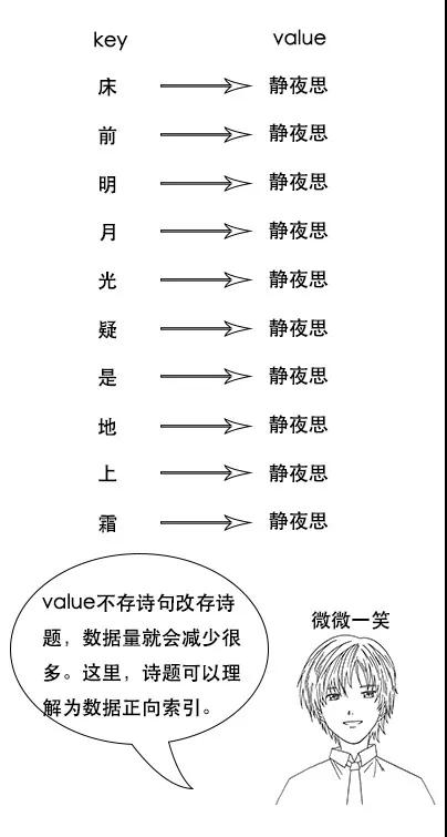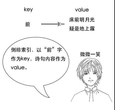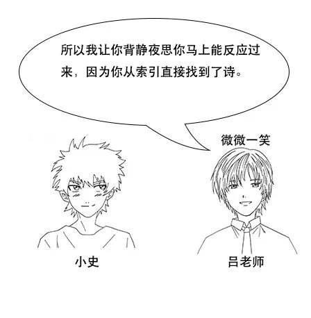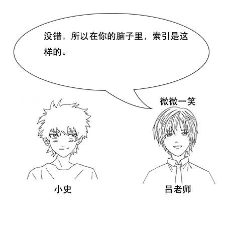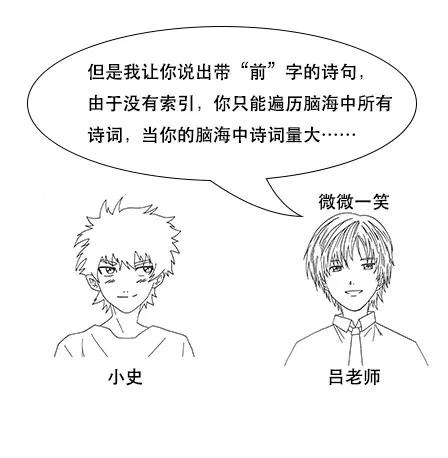 吕老师:但是我让你说出带“前”字的诗句,由于没有索引,你只能遍历脑海中所有诗词,当你的脑海中诗词量大的时候,就很难在短时间内得到结果了。