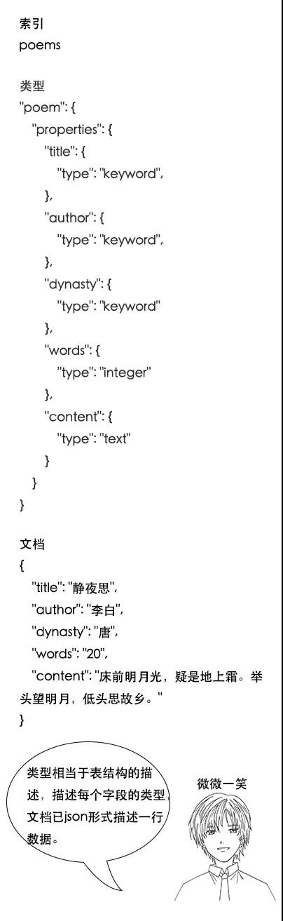 吕老师:比如一首诗,有诗题、作者、朝代、字数、诗内容等字段,那么首先,我们可以建立一个名叫 Poems 的索引,然后创建一个名叫 Poem 的类型,类型是通过 Mapping 来定义每个字段的类型。