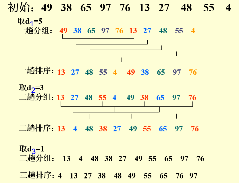 先取一个正整数d1<n,把所有相隔d1的记录放一组,组内进行直接插入排序。然后取d2<d1,重复上述分组和排序操作,直至di=1,即所有记录放进一个组中排序。