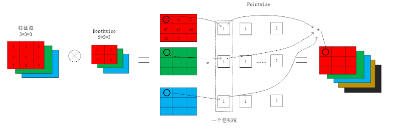 然后,重点介绍一下深度可分离卷积。深度可分离卷积将传统卷积的两步进行分离开来,分别是depthwise和pointwise。从下面的图可以看出,首先按照通道进行计算按位相乘的计算,此时通道数不改变;然后依然得到将第一步的结果,使用1*1的卷积核进行传统的卷积运算,此时通道数可以进行改变。使用了深度可分离卷积,其计算量为DK∗DK∗M∗DF∗DF+1∗1∗M∗N∗DF∗DF。