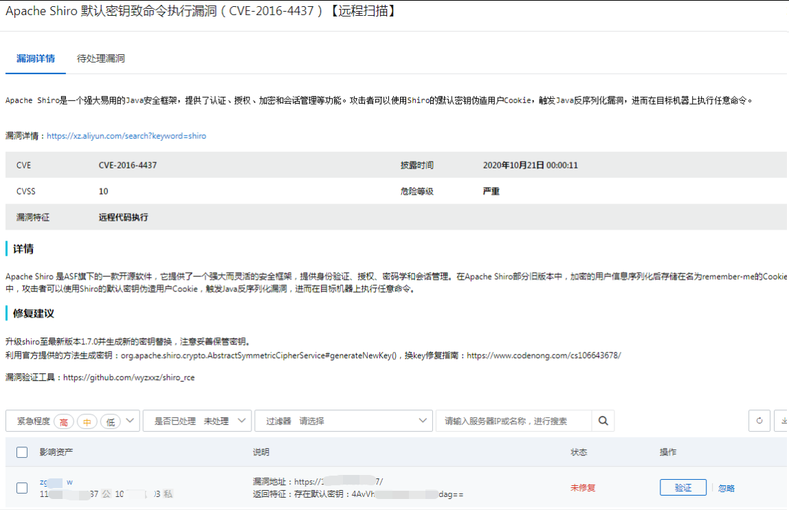 修复建议:升级shiro至最新版本1.7.0并生成新的密钥替换,注意妥善保管密钥。