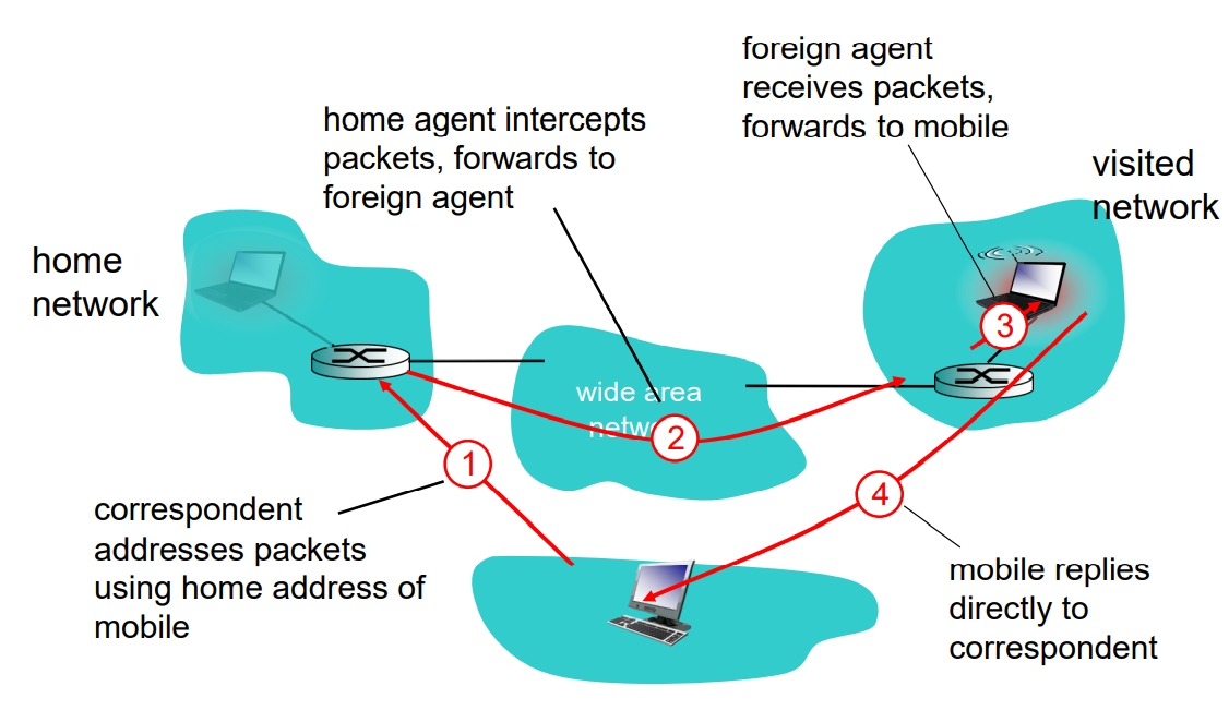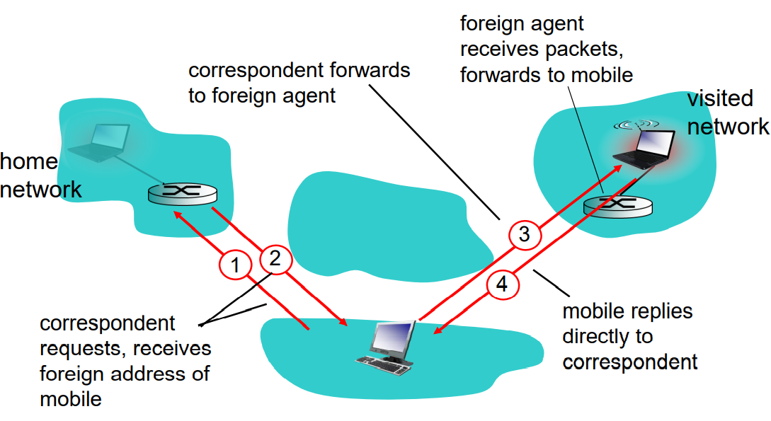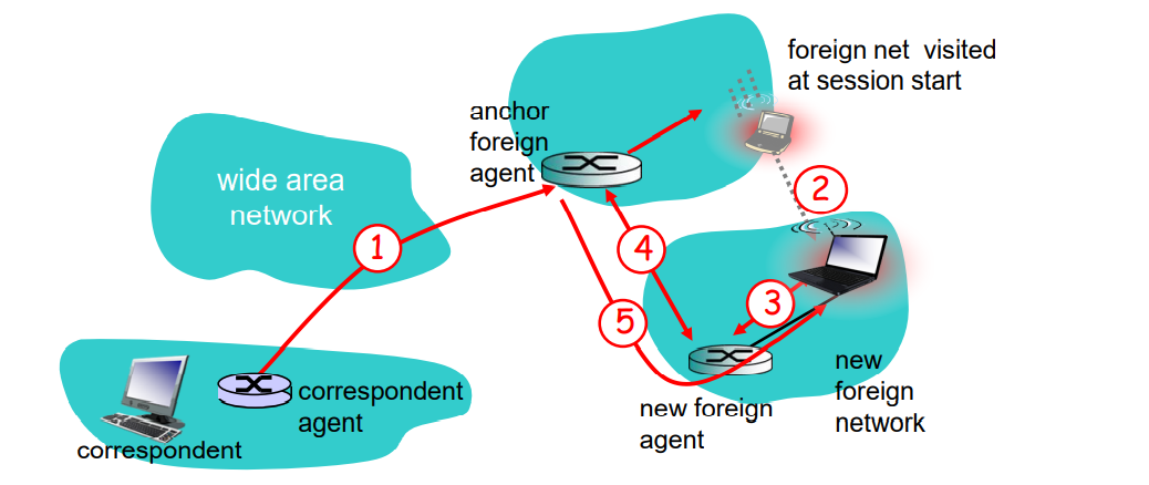 假设移动用户移动到另一个网络。向新的外部代理中有记录,同时外部代理与归属代理有联系,归属代理更新手机的转交地址,数据包继续转发到移动设备(但使用新的转交地址)。此时移动性、不断变化的外部网络透明,可以保持持续的连接!