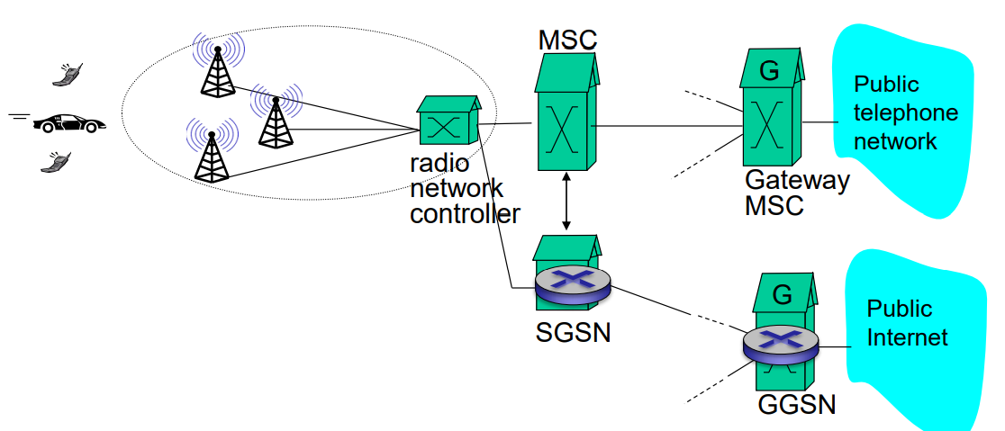 小区(cell):涵盖一定的地理区域。每个小区拥有一个类似于802.11 AP的基站(BS)。移动用户通过基站连接到网络。拥有空中接口,即移动设备和基站之间的物理和链路层协议。