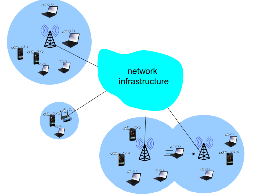 基础设施(例如APs) | 主机连接到连接到更大互联网的基站(WiFi、WiMAX、蜂窝) | 主机可能必须通过多个无线节点中继才能连接到更大的互联网:网状网络 |