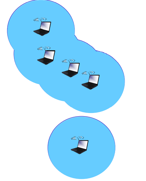 | 没有基础设施 | 没有基站,没有连接到更大的互联网(蓝牙、特设网络) | 没有基站,没有连接到更大的互联网。可能必须中继才能到达其他给定的无线节点MANET、VANET |
