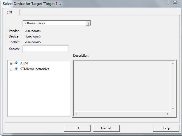 然后打开Keil5,新建工程,弹出如下对话框,选择第一个下拉框,第二个选项就OK