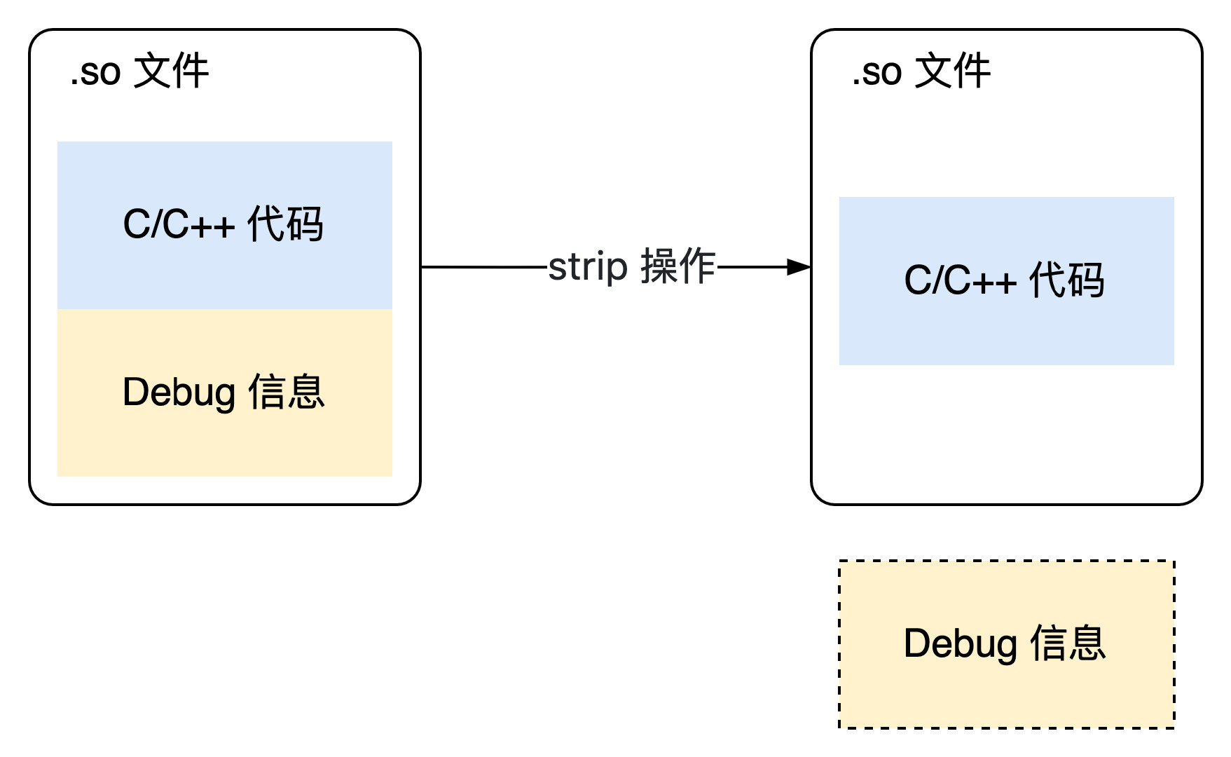 通常 release 的.so都是需要经过 strip 操作,strip 之后的.so中的 debug 信息会被剥离,整个 so 的体积也会缩小许多。