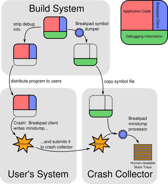 在 User’s System中运行的应用程序是通过 strip 去除了调式信息的,若应用程序发生 Crash,Breakpad client 就会写 minidump 文件到指定目录,也可以将产生的 minidump 文件发送到远端服务器即 Crash Colletcor。