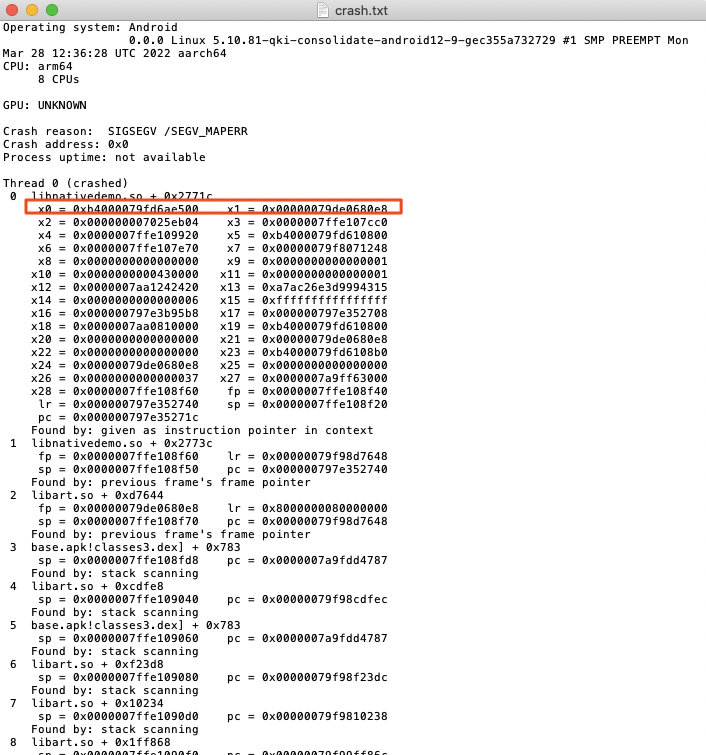 生成的 crash.txt 如下图所示,关键代码是红框的部分,Thread 0 后面有一个 crashed 标识,说明这里是发生崩溃的线程,而下面就是崩溃的文件以及内存地址,使用 3.1 中介绍的 addr2line 工具进行解析即可得到问题方法与行号