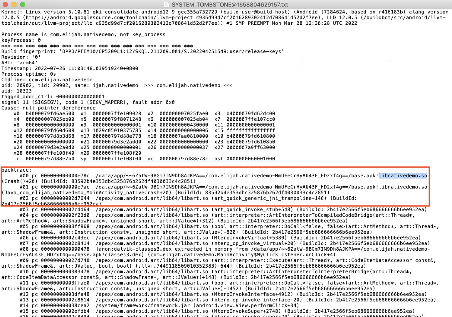 DropBox 中的 Tombstone 文件显示,Native Crash 发生在动态库 libnativedemo.so 中,具体的方法和行数可以用 Android/SDK/NDK 提供的工具 linux-android-addr2line 来进一步定位。