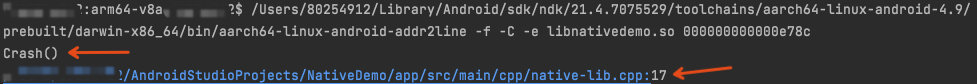 使用 addr2line 进行解析,结果可以看到,Native Crash 发生在文件 native-lib.cpp 的 17 行的 Crash() 方法中