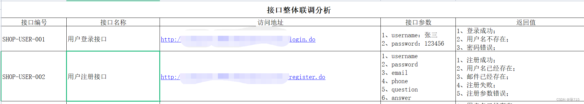 分析接口联调的业务,本次以修改密码为例:用户注册-->用户登录-->忘记密码-->提交密保问题答案-->修改密码-->用户登录。图1为简单整理的接口内容,未展示的接口也如此整理: