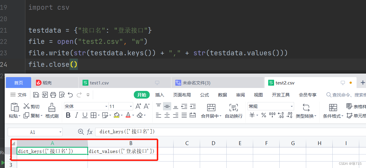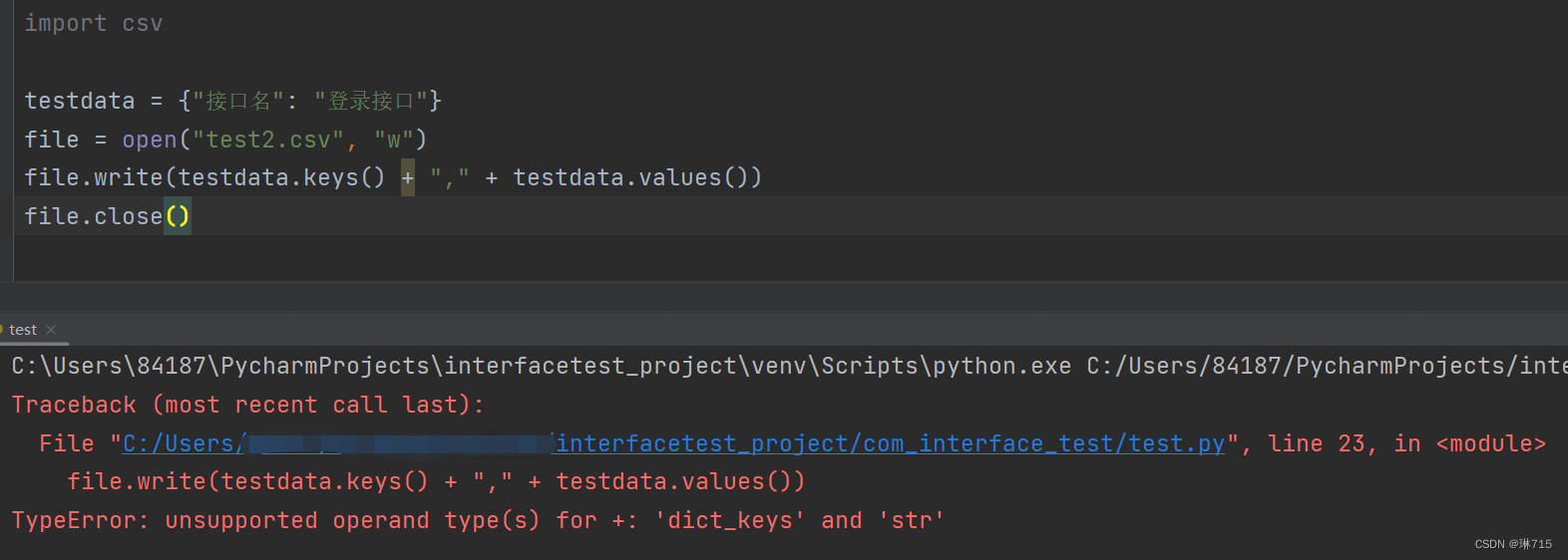 从图9可以看出,测试报告需要response的值和“测试通过”结论,且需要分开写入文件中,用return的方法不太可行,那么可以采用字典数据接收response和测试结论,然后再写入CSV文件中输出测试报告文件,这也是本次的技术难点,可以先做一个小试验,如何将字典数据的内容写入测试报告中?写入的方式有两种,覆盖写入(w)和追加写入(a),对于本次业务而言,w方式只能就放在main中,a方式可以单独写一个方法,其实代码编写方式基本一致,只是适用场景不同。