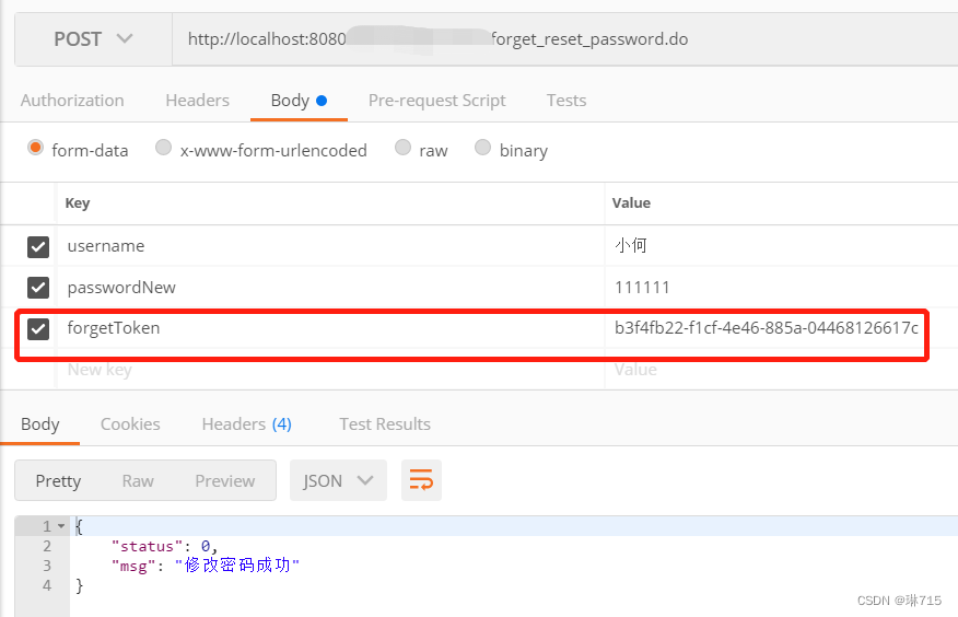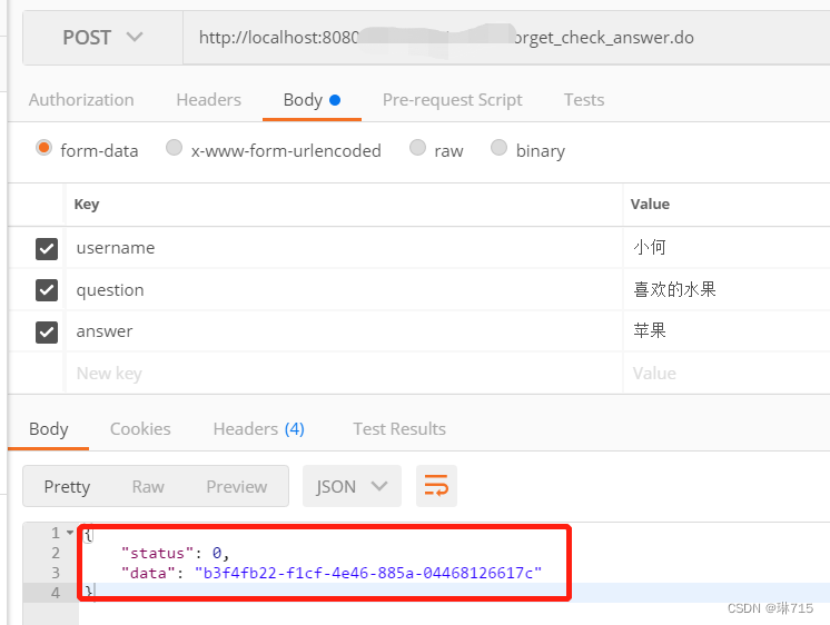 注:提交密码问题答案的接口,返回值是下一个接口(修改密码)其中的一个参数(forgetToken)。
