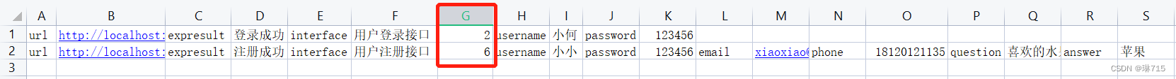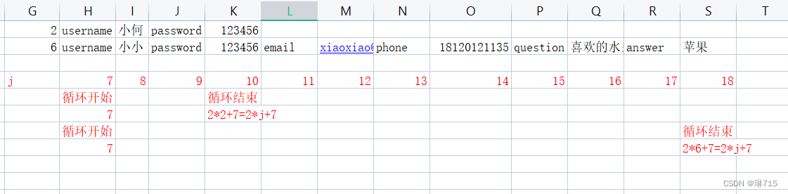 注意中间框选的数字列,是人为数出来后面有几个参数,方便后续循环读取。这里需要解决的难题有两个,一个是参数数量不同,另一个是之前脚本中用户参数是定义在字典数据userinfo中的,这样不仅要读取出来,还需要放入到字典数据中。先观察csv文件中每列所需值的下标规律,为了方便解释,可以观察下图(图8)所示: