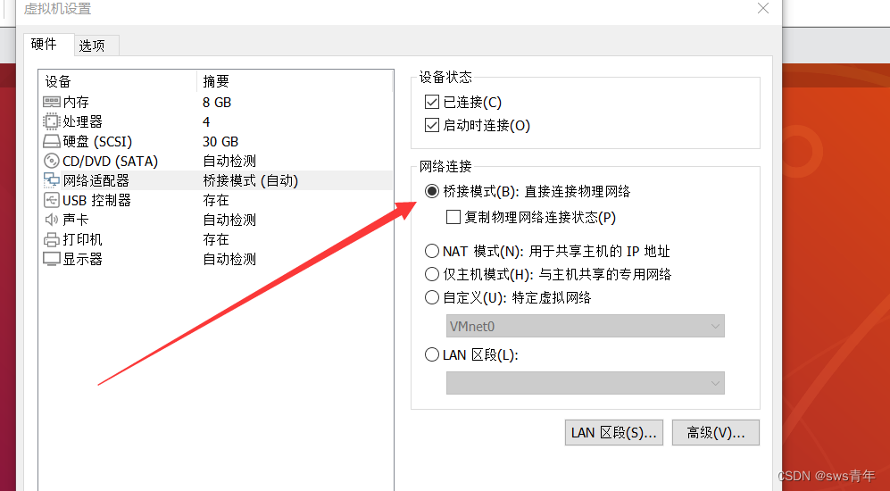 配置虚拟机,首先将虚拟机网络设置为桥接模式;