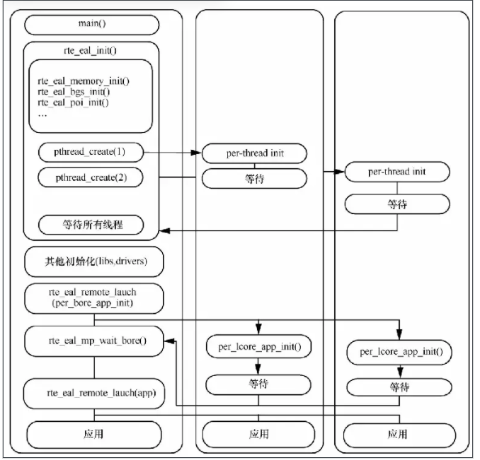 EAL 主要由 pthread 库的调用组成,主要库函数有 pthread_self()、pthread_create()和pthread_setaffinity_np()。