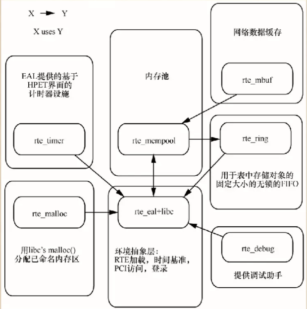 DPDK上层用户态有很多库组成,主要包括核心部件库(core Libraries)、平台相关模块(platform)、网卡轮询模式驱动没款、QoS库、报文转发分类算法等几大类,用户应用程序可以使用这些库进行二次开发。