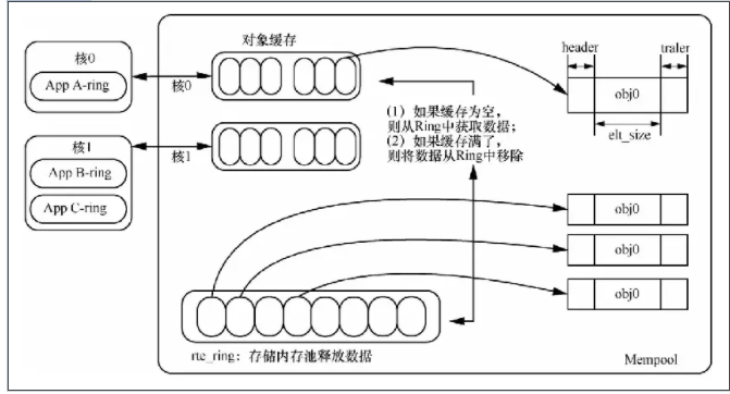 DPDK的Mempool(内存池)库主要供mbuf(内存缓冲区)库和EAL使用[3]。Mempool是一个大小固定的对象,在DPDK中,Mempool使用字符串名字进行标识,通过Ring方式存储对象。Mempool库也提供了一些可选服务(例如核对象缓存和校准助手),确保新添加的对象被均匀地分布在所有的DRAM或者DDR3通道上。