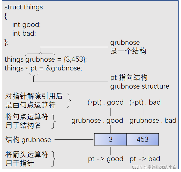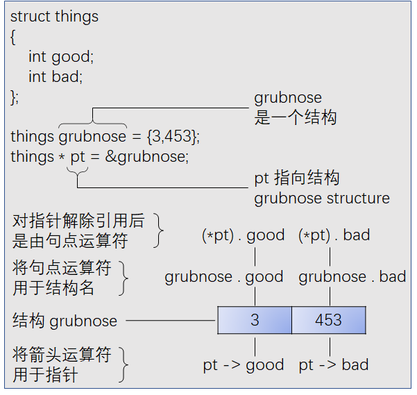 可以用来访问结构成员的运算符包括句点运算符(.)和箭头运算符(->)。如果结构标识符是结构名,则使用句点运算符;如果标识符是指向结构的指针,则使用箭头运算符。另外,如果 ps 是指向结构的指针,则 *ps 就是被指向的值——结构本身,此时可使用句点运算符访问结构成员,如 (*ps).price(C++的运算符优先规则要求使用括号)。