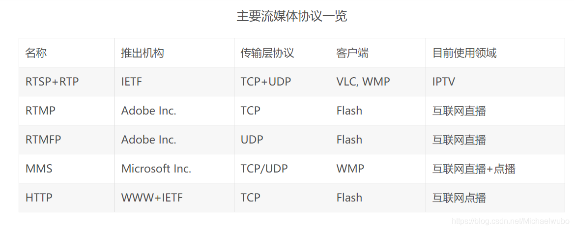 流媒体协议是服务器与客户端之间通信遵循的规定。当前网络上主要的流媒体协议如表所示。