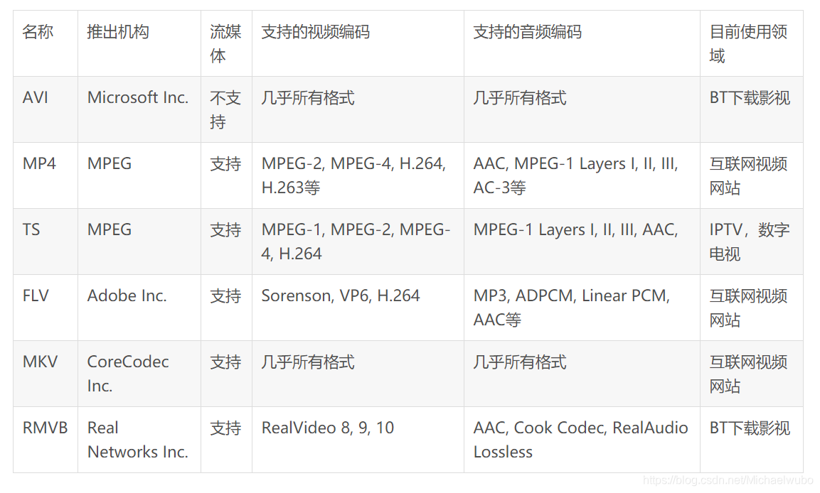封装格式的主要作用是把视频码流和音频码流按照一定的格式存储在一个文件中。现如今流行的封装格式如下表所示: