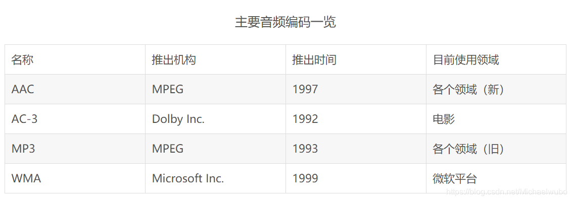 由表可见,近年来并未推出全新的音频编码方案,可见音频编码技术已经基本可以满足人们的需要。音频编码技术近期绝大部分的改动都是在MP3的继任者——AAC的基础上完成的。