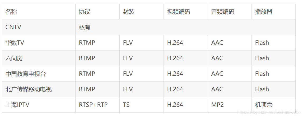 可以看出,直播服务普遍采用了RTMP作为流媒体协议,FLV作为封装格式,H.264作为视频编码格式,AAC作为音频编码格式。采用RTMP作为直播协议的好处在于其被Flash播放器支持。而Flash播放器如今已经安装在全球99%的电脑上,并且与浏览器结合的很好。因此这种流媒体直播平台可以实现“无插件直播”,极大的简化了客户端的操作。封装格式,视频编码,音频编码方面,无一例外的使用了FLV + H.264 + AAC的组合。FLV是RTMP使用的封装格式,H.264是当今实际应用中编码效率最高的视频编码标准,AAC则是当今实际应用中编码效率最高的音频编码标准。视频播放器方面,都使用了Flash播放器。