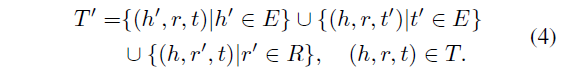 它是指正三元组中的一个实体或关系被整个集合中的另一个实体或关系随机替换。注意,与TransE不同,我们还添加了关系替换,以提高关系预测的性能。