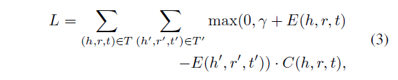 在本节中,我们将介绍模型的详细训练目标。根据TransE [Bordes et al., 2013],我们形式化了一个基于边际的分数函数,并将负采样作为训练目标。这个成对得分函数试图使正三元组的得分高于负三元组的得分。我们有: