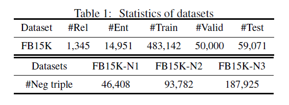 受名为三元组分类的评价任务预处理的启发,我们在[Socher et al., 2013]中按照相同的设置构造了负三元组。具体来说,给定一个正三元组(h;r;t)在KG中,我们随机切换其中一个头或尾实体以形成一个负三重(h0;r;t)或(h;r;t0)。实体替换受到dataset中与relation出现在相同位置的新实体的约束,即h0应该出现在正三组r的头位置(e.g. the head of relation write should be a writer)。这个约束侧重于生成更困难和更令人困惑的情况,因为那些带有错误样式实体的负三元组很容易被检测到。我们可以直接在Freebase中利用实体类型信息,或者遵循局部封闭世界假设[Krompa民兵等,2015]来收集实体约束信息。根据该协议,我们基于FB15K构造了3个带有噪声的正三组的KGs,分别为10%、20%和40%,然后丢弃少量违反类型约束的负三组。这些有噪声的数据集与FB15K共享相同的实体集、关系集、验证集和测试集,生成的所有负三元组都被融合到原始训练集中,表1列出了所有数据集的统计量。