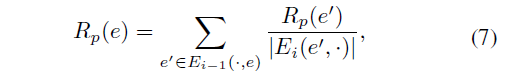 我们假设,如果一个关系路径从头尾实体承载了更多的信息流,那么它就应该被认为是更重要的。具体来说,我们遵循路径约束资源分配(PCRA) [Lin et al., 2015a]来度量关系路径可靠性。PCRA的关键思想受到资源配置的启发[Zhou et al., 2007],该思想假设有一定的资源与头实体h相关联,并通过所有关系路径流遍整个知识图。在给定实体对(h;t)。