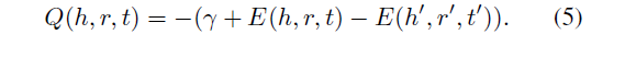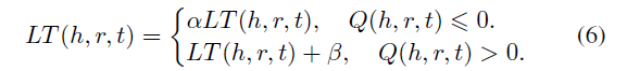 我们假设三元组越符合翻译规则,该三元组就越有说服力。为了在训练过程中测量局部三元组置信度,我们首先根据翻译假设来判断每个三重的当前一致性。受基于边际的训练策略启发,我们直接使用相同的成对函数来计算三重质量Q(h;r;t)如下:
