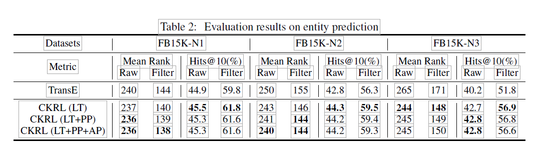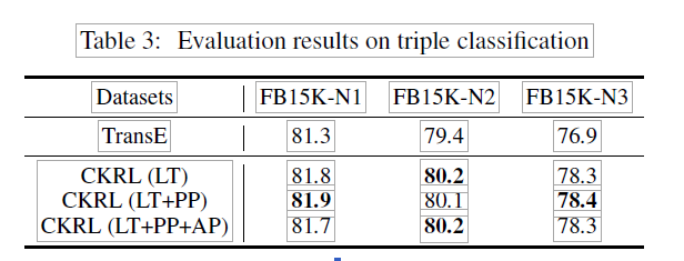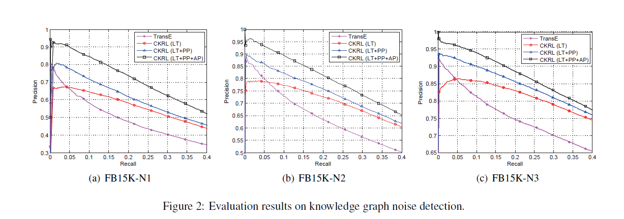 为了进行进一步的比较,我们还对PTransE进行了评估,它考虑了KRL中的多步路径,但结果却出人意料地比TransE差得多。我们发现,由于基于路径的能量函数分数只适用于两两比较,PTransE不能很好地区分噪声和正三组。由于空间有限,我们不给出PTransE的结果。