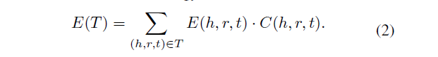 t∈E 且关系r∈R,其中E和R代表实体和关系的集合。T代表整个训练的三个事实,包括可能的冲突和噪音。为了检测知识图中可能存在的噪声并学习更好的知识表示方法,我们对每个三元组事实引入了一个新的三元组置信度概念。