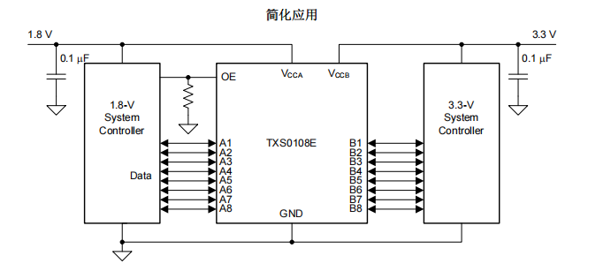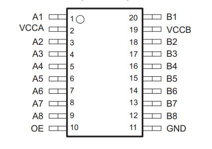 TXS0108EPWR是一款8位非反相转换器芯片,具有两个独立的可配置电源轨.A端口设计用于追踪VCCA.VCCA接受1.2至3.6V电源电压.B端口设计用于追踪VCCB.VCCB接受1.65至5.5V电源电压.这允许在任何1.2,1.5,1.8,2.5,3.3与5V电压节点之间进行低压双向转换.当输出启用(OE)输入为LOW时,所有输出均置于高阻状态.为确保上电或掉电时的高阻状态,OE应通过下拉电阻连接至GND,电阻的最小值由驱动器的电流源能力决定。