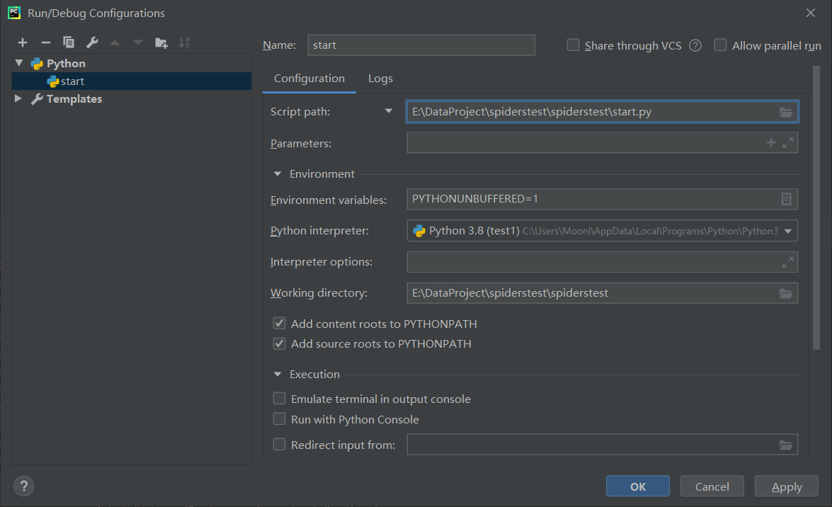 Script path 选择start.py脚本位置,然后apply-ok。