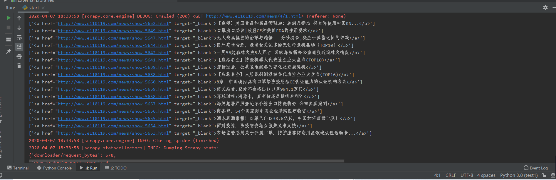 Scrapy 没有办法直接在PyCharm中建立,要在控制台里边建立,在PyCharm中编辑运行,Scrapy 安装和环境变量配置不再赘余。