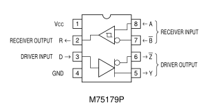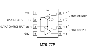 The M75176P is designed to connect the driver circuit output and the receiver input to each other internally, and serves as a line transceiver. The M75177P/M75178P is designed to connect the receiver circuit output and the driver circuit input internally, and serves as a line repeater. The M75177P and M75178P enter the output enabled state with active “H” and active “L”, respectively. The M75179P is equipped with abuilt-in differential driver and a built-in differential receiver. It does not have an output control input pin but its output im-pedance at the power-OFF time goes high.
